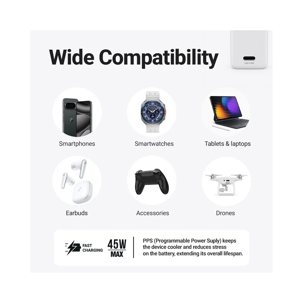 Crong Ultra Compact 45 W két dologban tűnik ki: nagyon kicsi ház (az egyik legkisebb 45 W-os töltő a piacon) és a PPS (Programozható Tápellátás) szabvány teljes támogatása. A PPS dinamikusan szabályozza a feszültséget, ami a gyakorlatban kevesebb hőt és hosszú távon kisebb akkumulátorhasználatot jelent.