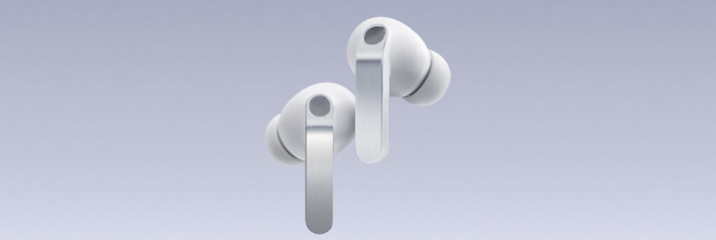 Galaxy Buds 4 Pro mają metalowe (aluminiowe) nóżki z matowym wykończeniem i delikatnymi rowkami dotykowymi. Etui jest płaskie, poziome, z przezroczystą pokrywą, przez którą widać słuchawki. Waga 5,1 g na słuchawkę czyni je jednymi z lżejszych w tej klasie.