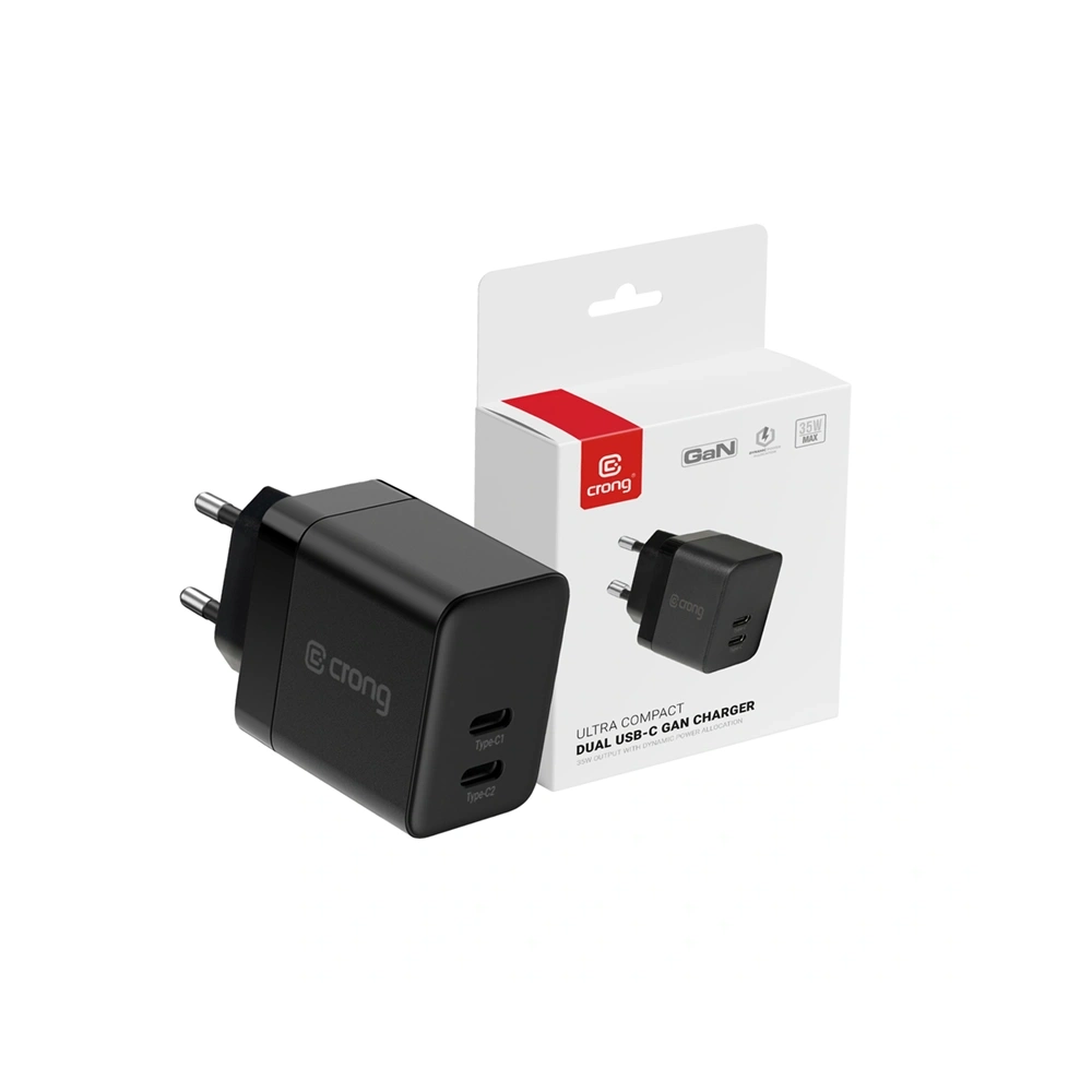 Zestaw Crong ładowarka sieciowa 2xUSB-C 35W + bezprzewodowa GaN PD PowerSpot Pivot Stand 3w1 czarna